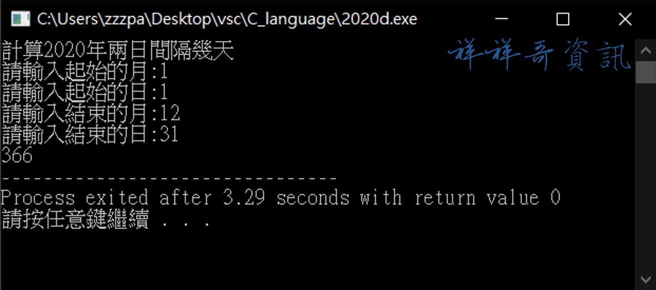 要求 : 1. 假設此程式適用西元2020年 2. 讓使用者可以輸入開始的月份跟日期與結束的月份跟日期 3. 程式需要自動計算開始日期到結束日期中總共有幾天 4. 假設輸入的結束日期一定晚於開始日期 5. 不可以使用陣列程式這題怎麼解呢 ? 答案跟說明如下 ~執行結果如下 :